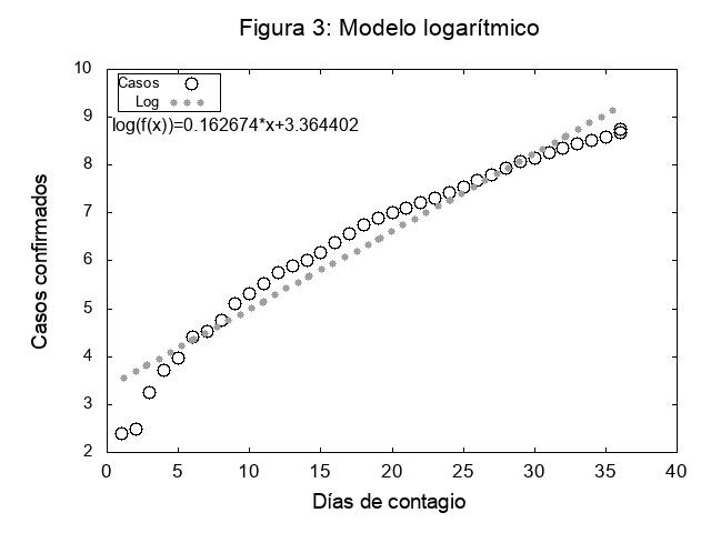 Por su parte el modelo logarítmico, del tipo ln[f(x)]=ax+b, destacando la tendencia del crecimiento en el número de casos confirmados desde el inicio del registro de los datos. Véase la siguiente figura.